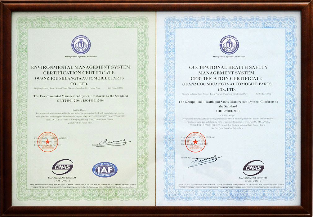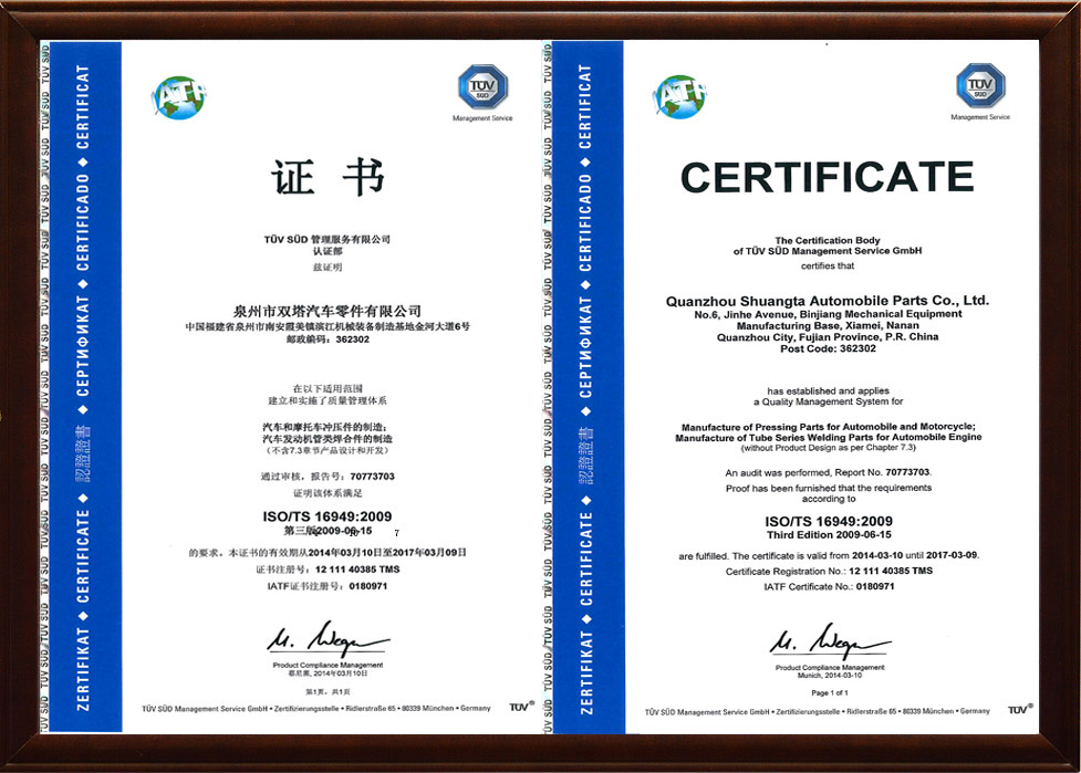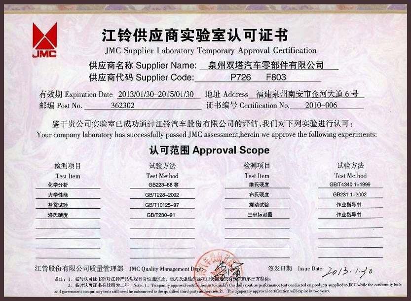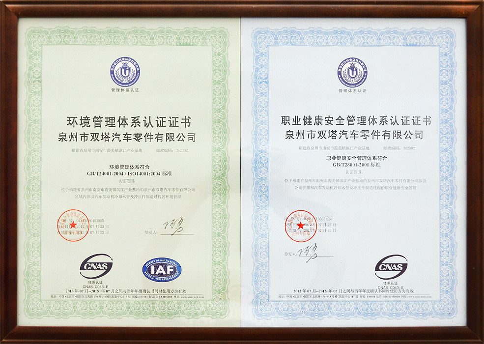 雙塔企業(yè)以汽車行業(yè)TS16949標(biāo)準(zhǔn)為基礎(chǔ)建立質(zhì)量管理體系,積極推進(jìn)ISO14001:2004環(huán)境管理標(biāo)準(zhǔn)和OHSAS 18001:2007職業(yè)健康安全體系的管理工作。通過(guò)體系延伸,汽車配件產(chǎn)品質(zhì)量控制由傳統(tǒng)的主機(jī)廠對(duì)供應(yīng)商生產(chǎn)質(zhì)量控制,延伸到原材料供應(yīng)商和輔配件供貨商,全面覆蓋從零配件供應(yīng)商、外協(xié)生產(chǎn)過(guò)程以及現(xiàn)場(chǎng)服務(wù)的質(zhì)量體系,確保全過(guò)程質(zhì)量控制。