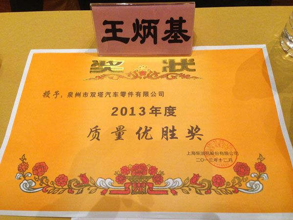 2013年12月21日,中國(guó)蘇州---中茵皇冠.金雞湖畔,召開上汽上柴供應(yīng)商年會(huì),“泉州市雙塔汽車零件有限公司”獲上汽上柴“2013年質(zhì)量?jī)?yōu)勝獎(jiǎng)”。