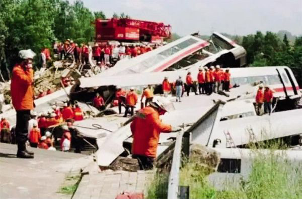 1998年,德國ICE系列的老大哥——ICE-1號(hào)列車從慕尼黑開往漢堡。到達(dá)艾雪德村附近時(shí),因?yàn)橐粋€(gè)零部件的問題,第二節(jié)車廂猛的脫離了軌道。接著,一節(jié)節(jié)車廂挨個(gè)脫軌。巧的是,鐵路上方一座橋梁橫跨而過。支撐梁被脫軌的第三節(jié)車廂撞毀,瞬間坍塌,壓到了第五節(jié)車廂上。后面的車廂,因?yàn)閼T性撞上了第五節(jié)車廂,瞬間成為一片廢墟。這輛列車?yán)?,總?00名乘客,有101人死亡,88人重傷,106人輕傷,成為了世界上傷亡率最高的鐵路事故。事后調(diào)查發(fā)現(xiàn),ICE-1使用的車輪是雙層鋼輪,這是一種用在慢速列車上的車輪,德鐵已經(jīng)多次接到更換的建議。但是運(yùn)行7年來,從未出過問題,于是建議被忽視,那維修時(shí)總該被發(fā)現(xiàn)吧,可是德鐵工作人員檢查滾輪時(shí),竟然只用手電筒照一照,最終因?yàn)殇撊Ξa(chǎn)生金屬疲勞斷裂(金屬疲勞:指一些金屬長時(shí)間承受遠(yuǎn)小于極限拉伸力的應(yīng)力,常年累月積累,最終斷裂),斜插入了列車車底;掛在列車車底的一小節(jié)鋼條,將變道時(shí)的防護(hù)軌挑起,防護(hù)軌洞穿了整個(gè)車廂,將整節(jié)車廂托起。于是有了前面講的一系列事故,造成了這次世界鐵路慘劇的發(fā)生。誰也沒有想到,這竟然發(fā)生在制造業(yè)位居世界前列的德國。但這,并不是德國高鐵最后一次發(fā)生事故,比如2017年和剛剛過去的2019年就發(fā)生兩起嚴(yán)重的脫軌事故。